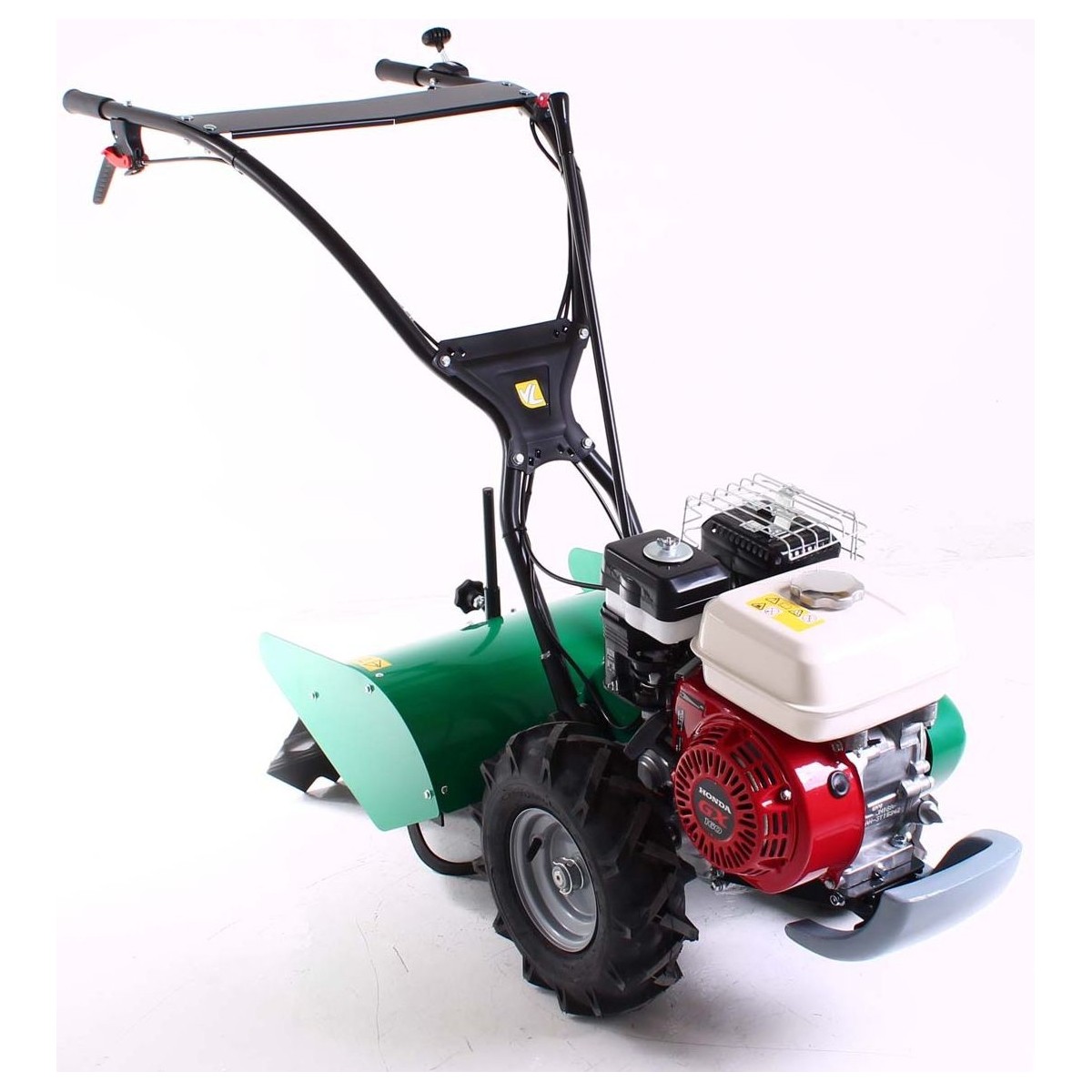 Moteur Honda GX160R 163cm3Largeur de travail 48cm - Profondeur de travail 15cmRotor 4 fraises japonaises labour Transmission japonaise aluminium double protection - 2 vitesses avant et 1 arrière - Lubrification par huile - Montage sur roulements à billes haute qualité - Embrayage par tension de courroieRoues agraire 350x6 - Béquille de terrage réglable et amovible sans outils - Guidon repliable, déportable et réglable en hauteurGarantie : 2 ans