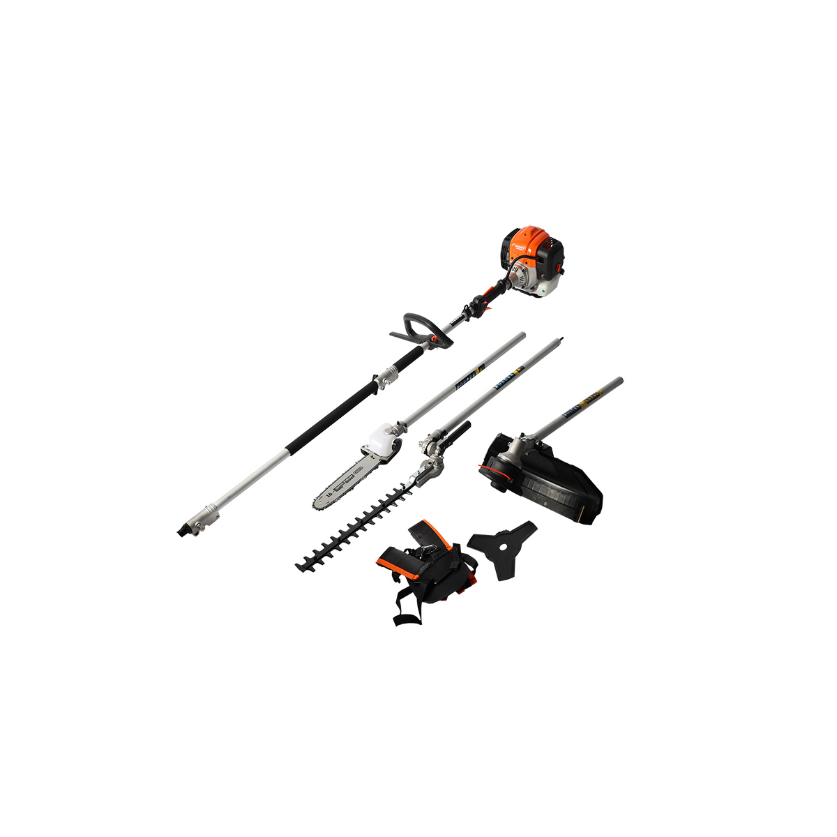 Moteur 2 temps 35,3cm3 / 1,2kWMoteur multifonctions 3 outilsOutil débroussailleuse avec tête fil semi-automatique 450mm et couteau métal 255mmOutil taille-haie 40cm - Outil élagage 25cmGarantie : 2 ans Energie : Thermique