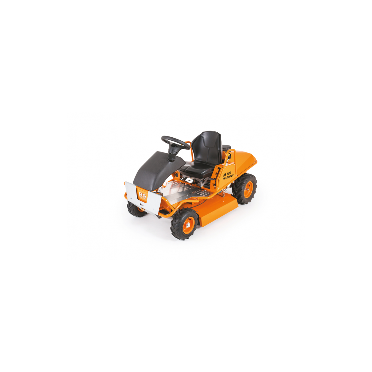 La tondeuse autoportée donnant une pelouse parfaite et un blocage de différentiel pour une meilleure traction. AS 800 FreeRider la grande sur de l'AS 799 Rider. Comme l'AS 799 Rider, la grande sur AS 800 FreeRider est dotée du moteur Briggs & Stratton de la série 3 Intek. Avec sa puissance maximal de 13,0 CV et l'entraînement de lame démultiplié, la tondeuse autoportée tond des hautes herbes jusqu'à 80 cm. C'est entre autre attribué au système de lames croisées AS. Le carter de coupe étant fermé, l'herbe coupée est ainsi défibrée et mulchée régulièrement. L'herbe coupée est déposée au centre et entre les roues. Ce qui permet de ne pas rouler sur l'herbe coupée et, de ce fait, d'assurer une meilleure sécurité lors d'une tonte dans des conditions humides et en pente. Le carter de coupe permet en outre de tondre en limite des bordures. Le réglage de la hauteur de coupe est centralisé et permet de choisir entre 4 hauteurs de 35 à 85 mm. En atteignant la position de parking du carter de coupe, la barre de coupe est automatiquement arrêtée par l'accouplement mécanique des lames. La transmission hydrostatique permet une propulsion progressive avec des vitesses de 0,0 à 8,0 km/h en marche avant et de 0,0 à 6,0 km/h en marche arrière. Celui-ci permet un ajustement optimal et sensible des vitesses à chaque utilisation. Le blocage de différentiel propose pour une meilleure propulsion, notamment sur les terrains irréguliers. Il peut être activé à tout moment avec la pédale. Le cadre tubulaire périphérique de l'AS 800 FreeRiders assure une haute stabilité et une haute résistance au gauchissement même en cas de fortes sollicitations. Le pare-chocs protège aussi les essieux et les suspensions de roues. L'utilisateur bénéficie d'une position assise droite et confortable grâce au siège baquet réglable vers l'avant et l'arrière et à la grande liberté pour les jambes ainsi générée. Avec en outre une direction très maniable, le travail ne génère pas de fatigue. La tondeuse peut tondre jusqu'à 6 800 m² par heure. Grâce à la puissance du moteur combinée à la propulsion par transmission hydrostatique et à la largeur de coupe de 80 cm. Le réservoir de 15 litres assure en outre une grande autonomie. Idéalement, l'AS 800 FreeRider s'utilise sur les terrains plats ou irréguliers. Grâce au moteur dotée d'une pompe à essence et à huile, au centre de gravité bas et au faible poids total de 227 kg, la tondeuse autoportée est parfaite pour les pentes. Les limites sont fixées par la sécurité de lutilisateur.