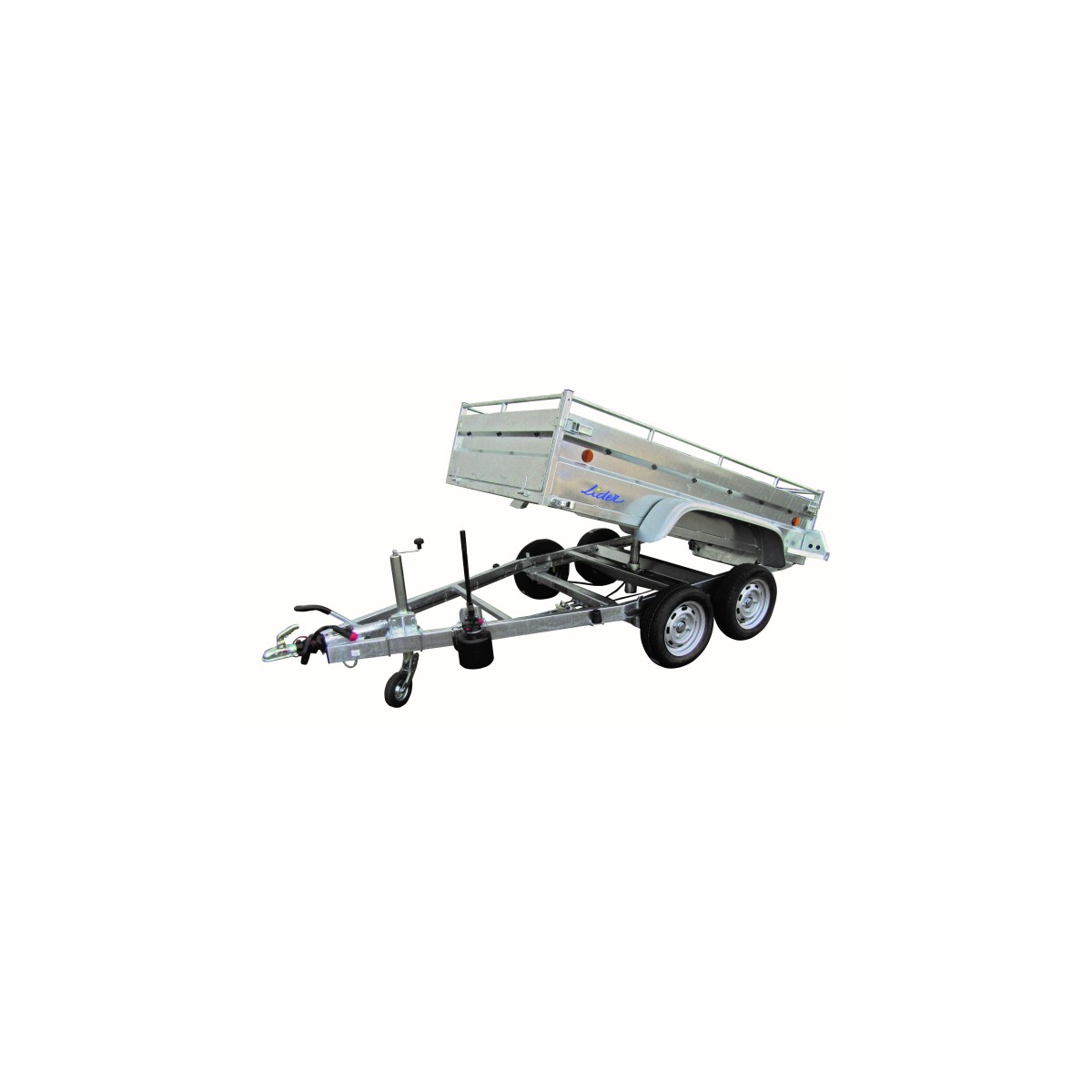 PTAC 1000-1100-1200-1300-1400-1500KG - Poids à vide 450kg2 essieux freinés 750kg - Roues 155/70R13Dimensions utiles 253x134x50cm - Dimensions hors tout 390x124cmTimon en V galvanisé - Châssis et caisse soudés galvanisés à chaud - Poteaux et ridelles amovibles - Ridelles acier galvanisé - Caisse basculante à pompe manuelle - Plancher lisse avec 4 poignées d'arrimage - Ridelles 4 côtés rabattables et amovibles - Roue jockey diamètre 60mmEquipements optionnels : Support et roue de secours - Bâche plate - Réhausse grillagée 60cm - Porte-échelle - Béquilles arrièreGarantie : 2 ans
