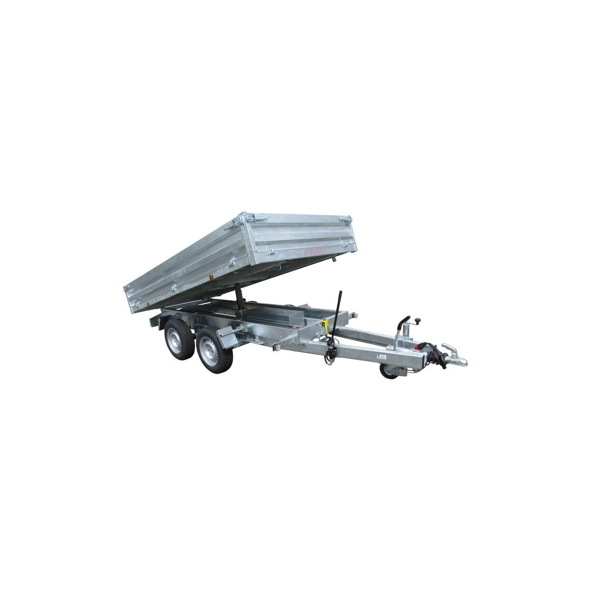 PTAC 1600-1700-1800-1900-2000-2500KG - Poids à vide 780kg2 essieux freinés 1300kg - Roues 165R14CDimensions utiles 322x170x35cm - Dimensions hors tout 476x184cmTimon en V galvanisé - Châssis et caisse soudés galvanisés à chaud - Poteaux et ridelles amovibles - Ridelles acier galvanisé - Caisse basculante à pompe électrique - Plancher lisse avec 4 poignées d'arrimage - Ridelles 4 côtés rabattables et amovibles - Roue jockey diamètre 60mmEquipements optionnels : Support et roue de secours - Réhausse grillagée 60cm - Porte-échelle - Béquilles arrièreGarantie : 2 ans